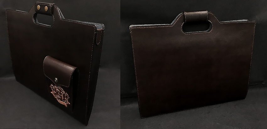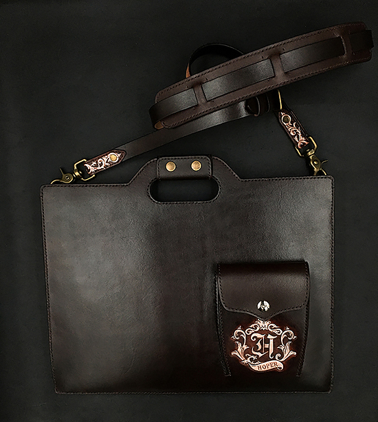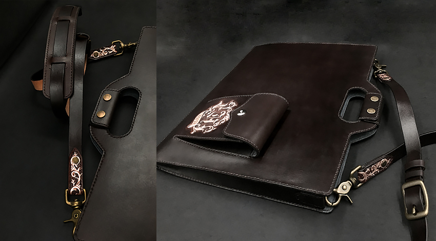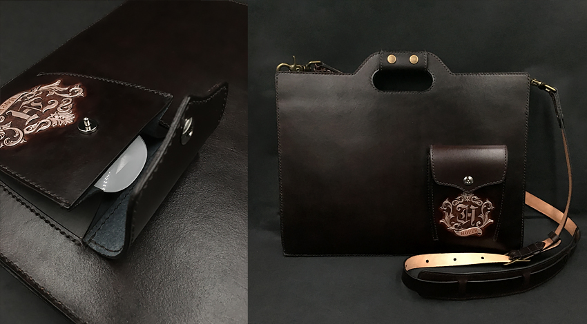 徽章圖騰由設計師設計,並搭配由花體字為基底設計的字母,再加上電燒手寫的風格與金屬色系,顯現出複古貴族的感覺,相信拿著他當電腦包、公事包,穿搭搭配都會帥的很有型。